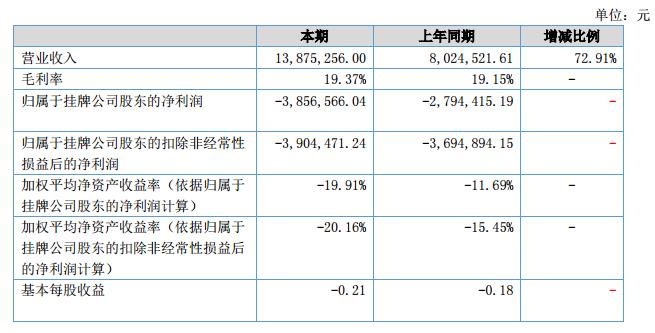 報(bào)告期內(nèi)公司實(shí)現(xiàn)營(yíng)業(yè)收入1387.52萬(wàn)元,同比增長(zhǎng)72.91%;凈利潤(rùn)為-385.66萬(wàn)元?。