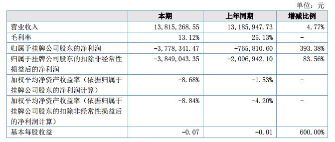 報告期內(nèi),公司實現(xiàn)營業(yè)收入1,382萬元,比上年同期的1,319萬元增長了63萬元,增長率為4.77%;銷售毛利率為13.12%,較上年同期減少十二個百分點;實現(xiàn)歸屬于掛牌公司股東的凈利潤為-377.83萬元,比上年同期減少393.38%。?