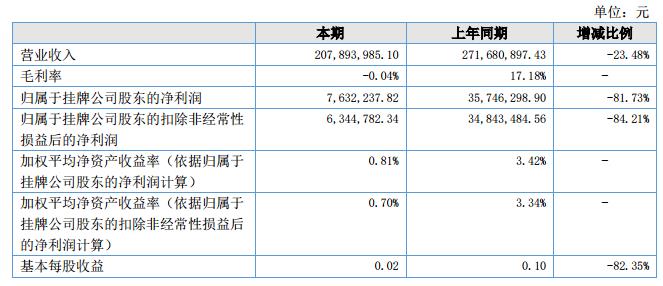 報(bào)告期公司實(shí)現(xiàn)營(yíng)業(yè)收入20,789萬(wàn)元,同比下降23.5%;歸屬于公司股東的凈利潤(rùn)為702萬(wàn)元,同比下降81.7%。?