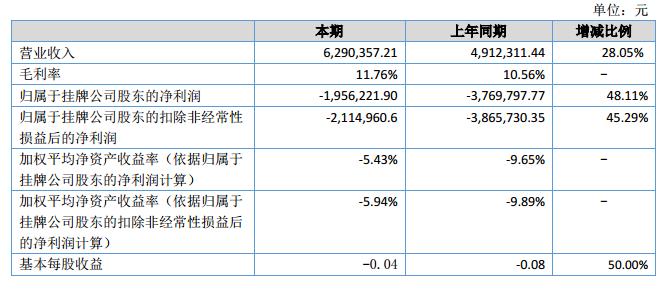 報(bào)告期末,公司實(shí)現(xiàn)營業(yè)收入629.04萬元,同比增長28.05%;歸屬于母公司所有者的凈利潤-195.62萬元,同比增加48.11%。?