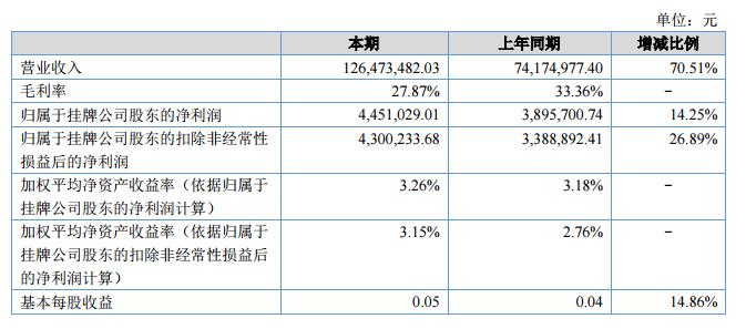 報告期內(nèi)公司實現(xiàn)營業(yè)收入12,647.35萬元,較去年同期的7,417.50萬元增加了70.51%;?公司實現(xiàn)凈利潤4,451,029.01元,同比增長14.25%。