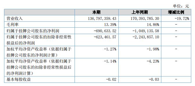 報(bào)告期內(nèi)公司實(shí)現(xiàn)營(yíng)業(yè)收入1.37億,較上年同期1.70億減少3,360萬(wàn),同比下降19.72%;報(bào)告期實(shí)現(xiàn)凈利潤(rùn)-68萬(wàn),較上年同期-104萬(wàn)減少虧損36萬(wàn)。?