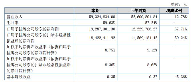 公司在報告期內(nèi)的主營業(yè)務(wù)收入為59,324,834.00元,比上年度增長12.78%;報告期內(nèi)毛利率為59.63%比上期上升2.39%,總體變化幅度不大。毛利率略有上升;凈利潤為19,286,094.14元,比上期增長21.71%。