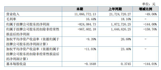 報(bào)告期內(nèi),公司實(shí)現(xiàn)營業(yè)收入11,066,772.13元,上年同期營業(yè)收入21,724,720.27元,較上年同期減少49.06%;凈利潤報(bào)告期內(nèi),公司凈利潤-824,084.73元,上年同期凈利潤1,872,726.25元,較上年同期減少144.00%。