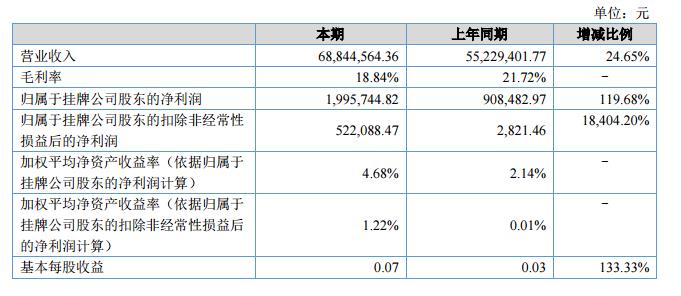 報告期內,公司實現營業(yè)收入6,884.46萬,比去年同期增加1,361.52萬,增長率為24.65%;報告期內凈利潤為199.57萬,較去年同期的增長108.73萬,增長率為119.68%。