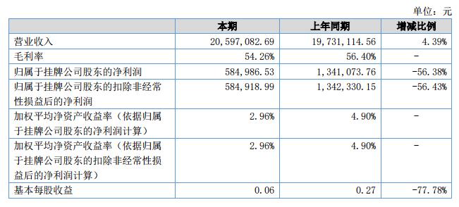 報告期內(nèi),公司實現(xiàn)營業(yè)收入2,059.71萬元,上年同期為1,973.11萬元,增加86.60萬元,增長幅度為4.39%;凈利潤為58.49萬元,上年同期為134.11萬元,下降幅度為56.38%?。