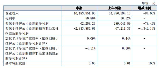 公司經(jīng)營成果:截止報(bào)告期末,公司營業(yè)收入為10,183,951.90元,較去年同期減少84.06%;歸屬于母公司所有者的凈利潤為62,258.23元,較上年期末減少78.46%。?