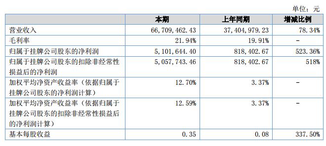 報(bào)告期內(nèi)公司實(shí)現(xiàn)營(yíng)業(yè)收入6670.95萬(wàn)元,比上年同期增加2930.45萬(wàn)元,增長(zhǎng)率達(dá)78.34%;報(bào)告期內(nèi)實(shí)現(xiàn)凈利潤(rùn)510.16萬(wàn)元,比上年同期增加428.32萬(wàn)元,增長(zhǎng)率523.36%。?