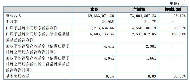 報(bào)告期內(nèi),實(shí)現(xiàn)營(yíng)業(yè)總收入8,988.31萬(wàn)元,較2017年同期增長(zhǎng)23.12%;歸屬于掛牌公司股東的凈利潤(rùn)721.36萬(wàn)元,較2017年同期增長(zhǎng)58.33%。?