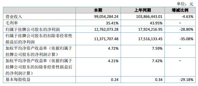 報告期內(nèi)公司實現(xiàn)營業(yè)收入99,054,284.24元,較上年同期下降4.63%;實現(xiàn)歸屬于母公司股東凈利潤12,762,073.28元,較上年同期減少28.80%。?