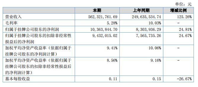 報(bào)告期內(nèi)公司實(shí)現(xiàn)營業(yè)收入5.62億元,較上年同期同比增長125.26%;公司實(shí)現(xiàn)凈利潤1036.38萬元,較上年同期同比增長24.81%。?