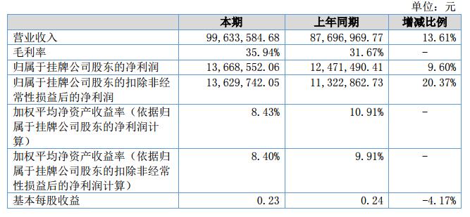 報告期內(nèi),公司實現(xiàn)營業(yè)收入9,963.36萬元,同比增長13.61%;公司實現(xiàn)凈利潤1,316.87萬元,同比增長6.90%。?