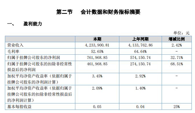 1、經(jīng)營(yíng)業(yè)績(jī)公司 2018 年上半年實(shí)現(xiàn)營(yíng)業(yè)收入 4,233,900.81 元,較上年同期增長(zhǎng) 2.42%,實(shí)現(xiàn)歸屬于掛牌公司股東的凈利潤(rùn) 761,968.85 元。公司經(jīng)營(yíng)活動(dòng)產(chǎn)生的現(xiàn)金流量?jī)纛~為 739,270.18 元,較去年同期增長(zhǎng)了 173.71%,主要是因?yàn)楣句N售回款情況比較理想、應(yīng)收票據(jù)及應(yīng)收賬款未大幅增長(zhǎng),使公司銷售商品提供勞務(wù)收到的現(xiàn)金較去年同期大幅增加所致。公司資產(chǎn)總額為 27,328,580.01 元,較期初總資產(chǎn)增長(zhǎng) 1.56%,公司負(fù)債總額為 4,861,301.67 元,較期初下降 6.56%,資產(chǎn)負(fù)債規(guī)模變動(dòng)不大。公司凈資產(chǎn)為 22,467,278.34 元,較上年同期 21,705,309.49 元凈增加 761,968.85 元,一方面是由于公司成功掛牌中介服務(wù)費(fèi)降低、另一方面是因?yàn)楣炯訌?qiáng)費(fèi)用控制辦公費(fèi)及會(huì)務(wù)費(fèi)下降,從而使管理費(fèi)用大幅下降所致。