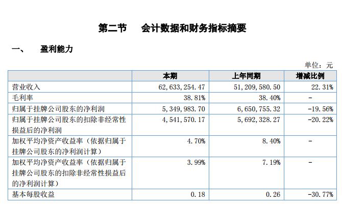報(bào)告期內(nèi),公司實(shí)現(xiàn)營(yíng)業(yè)收入 62,633,254.47 元,較去年同期增加了 11,423,673.97 元,增長(zhǎng)率為 22.31%,主要隨著公司業(yè)務(wù)實(shí)力和品牌知名度的提升,公司業(yè)務(wù)規(guī)模得以提升,營(yíng)業(yè)收入得到提高,其中主要是地理信息數(shù)據(jù)庫業(yè)務(wù)的規(guī)模擴(kuò)張。報(bào)告期內(nèi)公司營(yíng)業(yè)成本為 38,325,290.12 元,較去年同期增加 6,779,624.32 元,增長(zhǎng)率為 21.49%,主要系公司規(guī)模擴(kuò)大,業(yè)務(wù)量增加,營(yíng)業(yè)成本相應(yīng)提高所致。歸屬于掛牌公司股東的凈利潤(rùn) 5,349,983.70 元,較去年同期下降 1,300,771.62 元,降低 19.56%,主要是本期公司按照《企業(yè)會(huì)計(jì)準(zhǔn)則 11 號(hào)——股份支付》的規(guī)定進(jìn)行會(huì)計(jì)處理,確認(rèn)股份支付的金額為 4.5 元/股,合計(jì) 540 萬元,股份支付的部分計(jì)入損益及資本公積。