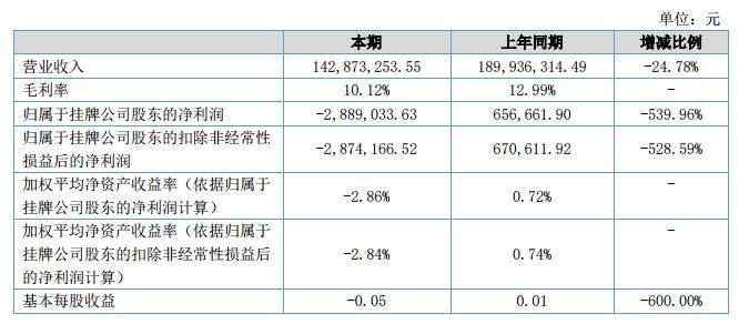 公司在報(bào)告期內(nèi)的營(yíng)業(yè)收入為142,873,253.55元,比去年同期降低了24.78%。營(yíng)業(yè)成本為128,409,994.16元,比去年同期降低了22.30%。歸屬于母公司所有者的凈利潤(rùn)為-2,889,033.63元,比去年同期增虧3,545,695.53元。?
