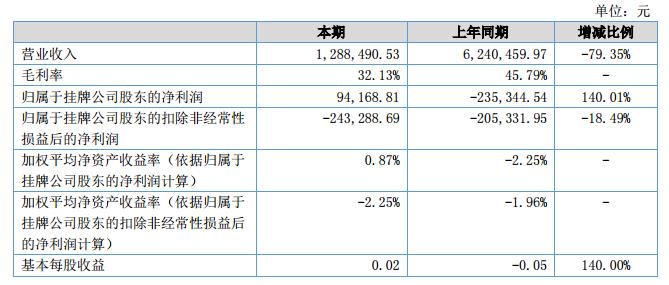 報(bào)告期內(nèi)公司實(shí)現(xiàn)營業(yè)收入1,288,490.53元,較上年同期減少79.35%;與此同時(shí)營業(yè)成本874,393.02元,較上年同期減少74.15%;報(bào)告期內(nèi)毛利率32.13%,上年同期45.79,毛利率同比下降13.66%;實(shí)現(xiàn)凈利潤94,168.81元,較上年同期增加近33萬。?