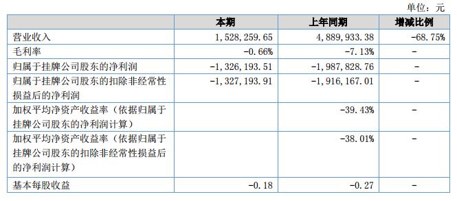 報(bào)告期內(nèi),公司營(yíng)業(yè)收入為152.83萬(wàn)元,同比上期下降了68.75%;報(bào)告期公司凈利潤(rùn)為-132.62萬(wàn)元,同比上期減少虧損33.28%。?