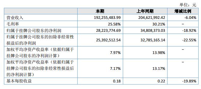 報(bào)告期內(nèi)營(yíng)業(yè)收入192,255,483.99元,同比減少6.04%;利潤(rùn)總額和凈利潤(rùn)分別為32,467,862.89元、28,223,774.69元,同比減少19.2%、18.92%,?