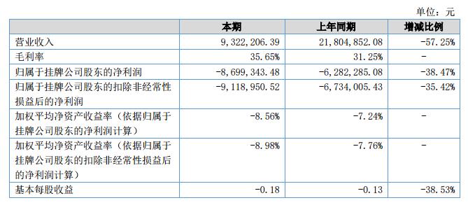 報告期內(nèi),公司實現(xiàn)營業(yè)收入9,322,206.39元,較上年同期減少57.25%;營業(yè)成本為5,998,758.81元,比上年同期減少59.99%;歸屬于母公司的凈利潤為-8,699,343.48,較上年同期減少38.47%。?