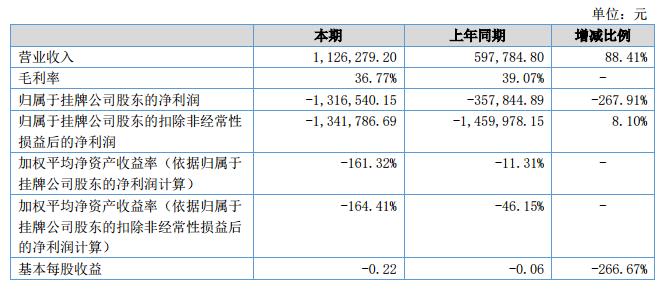 公司報告期內(nèi)實現(xiàn)營業(yè)收入112.63萬元,比去年同期增加52.85萬元,增加了88.41%;實現(xiàn)營業(yè)成本71.22萬元,比去年同期增加34.79萬元,增加了95.52%;實現(xiàn)凈利潤-131.65萬元,比去年同期減少95.87萬元,減少了267.91%。實現(xiàn)現(xiàn)金及現(xiàn)金等價物凈增加額2.64萬元,較上年同期現(xiàn)金及現(xiàn)金等價物凈增加額-20.49萬元,增加了112.89%。?