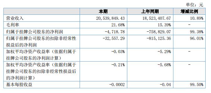 報告期內(nèi)公司實現(xiàn)營業(yè)收入2,053.98萬元,同比上漲10.89%;利潤總額和凈利潤分別為-6.16萬元和-0.47萬元,同比分別增長92.20%和99.38%?。