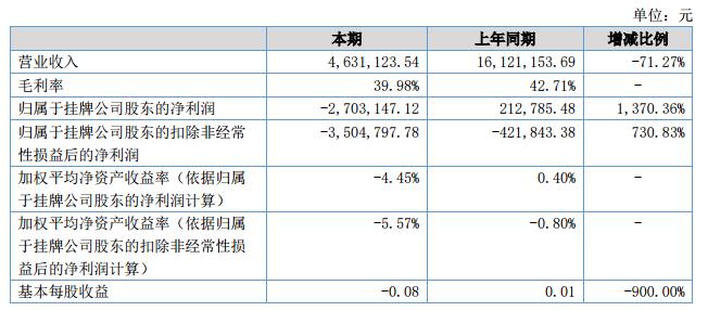 報(bào)告期內(nèi)實(shí)現(xiàn)營(yíng)業(yè)總收入4,631,123.54元,比上年同期減少71.27%,凈利潤(rùn)為-2,731,732.03元,比上年同期減少1432.19%。截至報(bào)告期末,公司資產(chǎn)總額63,722,555.78元,比上年同期減少3.76%;負(fù)債總額8,587,601.05元,比上年同期減少36.81%;凈資產(chǎn)55,134,954.73元,比上年同期上升4.51%。歸屬母公司凈利潤(rùn)-2,703,147.12元,每股收益-0.08元,較上年同期每股收益下降900.00%。?