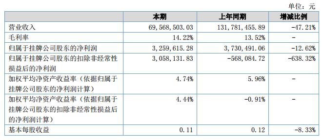 報告期內實現(xiàn)營業(yè)收入6,956.85萬元,實現(xiàn)凈利潤325.96萬元。報告期綜合毛利率為14.22%,較上年同期略有上升。報告期內公司總資產為19,654.11萬元,同比下降8.47%,凈資產7,043.63萬元,同比增加4.85%。?