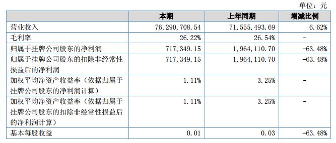 公司在報告期內的主營業(yè)務收入為7629.07萬元,比上年同期增長6.62%;營業(yè)成本為5256.78萬元,比上年度增長7.08%;歸屬于母公司的凈利潤為71.73萬元,比上年同期下降63.48%。?
