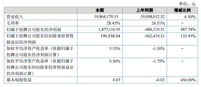 報告期,實現(xiàn)營業(yè)收入19,864,170.53元,較上年同期增長4.50%;實現(xiàn)凈利潤1,877,116.95元,較上年同期增長487.74%,凈利潤增幅較大,主要是報告期收到新三板掛牌獎勵基金200萬元。?
