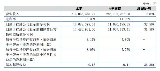 報(bào)告期內(nèi),實(shí)現(xiàn)營(yíng)業(yè)收入315,056,348.21萬(wàn)元,同比增長(zhǎng)9.89%,實(shí)現(xiàn)歸屬于母公司股東的凈利潤(rùn)14,688,379.03萬(wàn)元,同比增長(zhǎng)32.56%。?