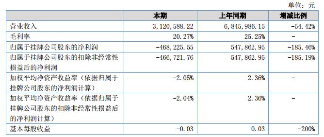 報告期內(nèi),公司實現(xiàn)營業(yè)收入3120588.22元,同比下降54.42%;營業(yè)成本2488024.50元,同比下降51.38%;凈利潤-468225.55元,同比下降185.19%。?