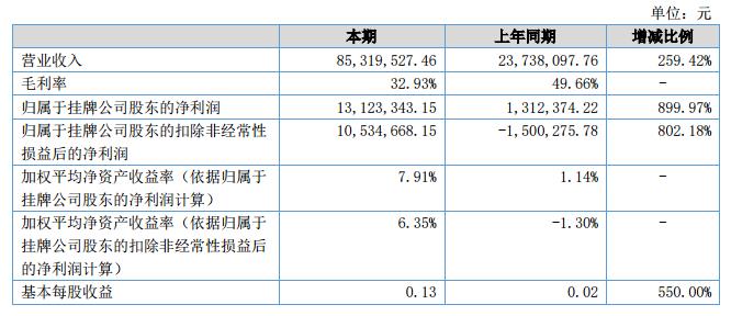 報(bào)告期內(nèi)公司實(shí)現(xiàn)營(yíng)業(yè)收入8,531.95萬元,較上年同期增長(zhǎng)259.42%;歸屬于掛牌公司股東的凈利潤(rùn)1,312.33萬元,較上年同期增長(zhǎng)899.97%。