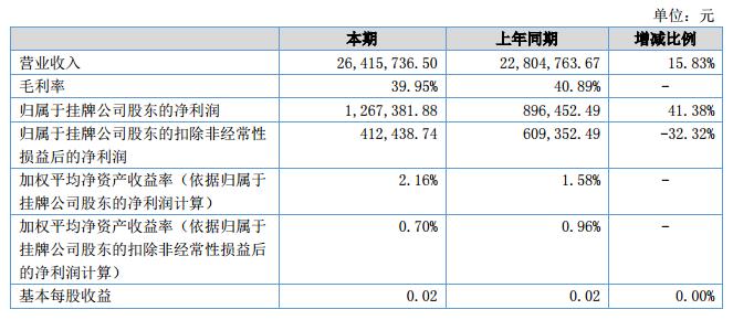 報(bào)告期內(nèi)公司實(shí)現(xiàn)營(yíng)業(yè)收入26,415,736.50元,較2017年上半年增長(zhǎng)了15.83%;營(yíng)業(yè)成本15,862,868.27元,較2017年上半年增長(zhǎng)了17.68%,主要系公司改變銷(xiāo)售戰(zhàn)略,多向客戶(hù)爭(zhēng)取訂單所致;凈利潤(rùn)1,267,381.88元,較2017年6月上漲41.38%,主要原因是本期政府補(bǔ)助收益增加所致。?