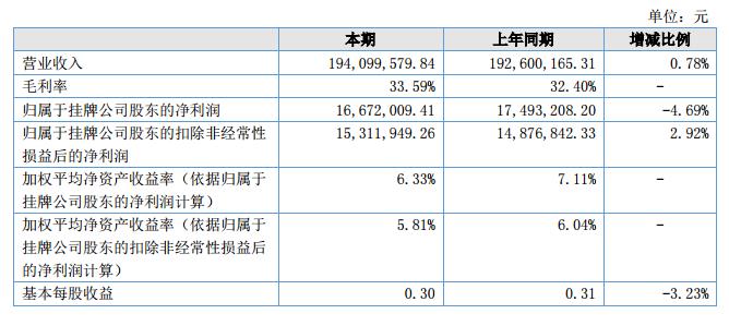報告期內(nèi),公司實現(xiàn)營業(yè)收入194,099,579.84元,比上年同期增加0.78%;報告期內(nèi),公司實現(xiàn)歸屬于掛牌公司股東扣非后的凈利潤15,311,949.26元,比上年同期增加2.92%。?