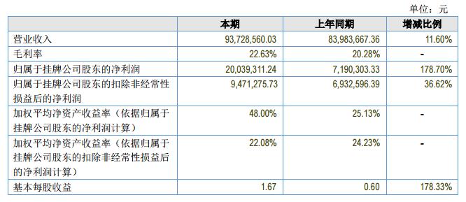 公司在報(bào)告期內(nèi)的營業(yè)收入為93,728,560.03比上年度增長11.60%;營業(yè)成本為72,519,362.82,比上年度增長8.31%;歸屬于母公司的凈利潤為20,039,311.24,比上年度增長178.70%。?