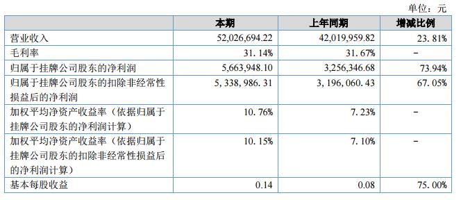 報(bào)告期內(nèi)公司在穩(wěn)定老客戶及原有市場的情況下,加強(qiáng)新市場的開發(fā),特別是對國際市場的開發(fā)力度;同時(shí)加大研發(fā)力度,提高產(chǎn)品質(zhì)量及產(chǎn)品的性能。2018年上半年公司實(shí)現(xiàn)銷售收入52,026,694.22元,同比增長23.81%,實(shí)現(xiàn)凈利潤5,663,948.10元。?