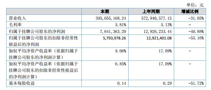 報告期內(nèi)公司實現(xiàn)營收3.95億元,比上年同期減少1.78億元,降幅31.05%;凈利潤764萬元,比上年同期減少528萬元,降幅40.88%。?
