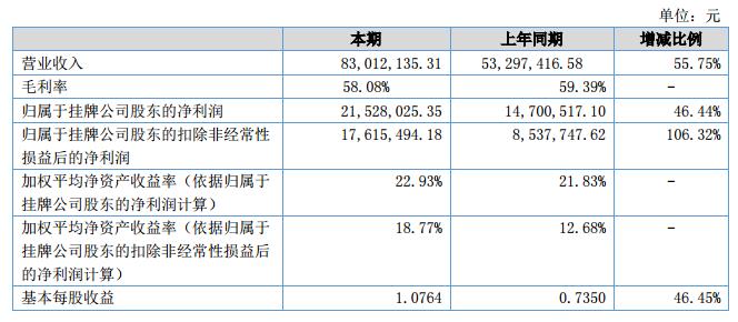 報(bào)告期內(nèi),公司實(shí)現(xiàn)營業(yè)收入83,012,135.31元,較上年同期銷售收入53,297,416.58元增長55.75%;公司凈利潤為21,528,025.35元,較上年同期凈利潤14,700,517.10元,增長了46.44%。公司實(shí)現(xiàn)總資產(chǎn)191,438,469.47元,凈資產(chǎn)97,131,213.36元。?