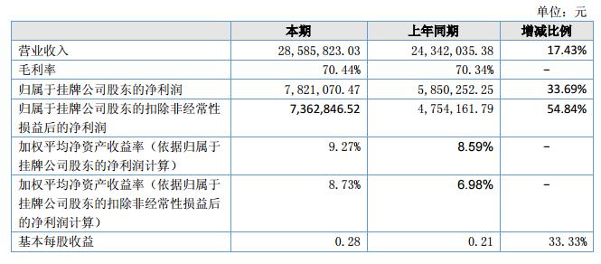 報告期內(nèi)公司實現(xiàn)營收收入28,585,823.03元,較去年同期增加銷售金額4,243,787.65元,增長率為17.43%,增長的主要原因為公司大力發(fā)展的反信息詐騙產(chǎn)品在上半年市場取得較好的成果。報告期內(nèi)歸屬于母公司所有者的凈利潤為7,821,070.47元,較去年同期增加1,970,818.22元,增長率為33.69%,;主要上半年中標(biāo)多個省的反信息詐騙項目所致。?