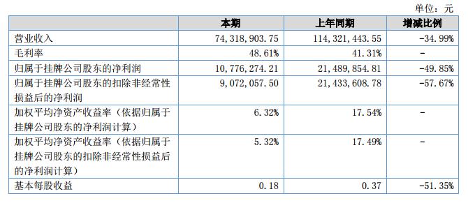 報告期內公司營業(yè)收入7,431.89萬元,較上年同期減少4,000.25萬元,減幅34.99%;歸屬于掛牌公司股東的凈利潤1,077.63萬元,較上年同期減少1,071.36萬元,減幅49.85%。?