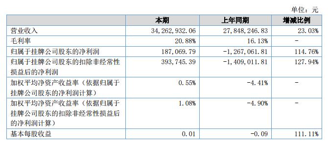在本報(bào)告期內(nèi),公司實(shí)現(xiàn)營(yíng)業(yè)收入3426.29萬元,比去年同期增長(zhǎng)25.82%,主要系公司加大業(yè)務(wù)拓展,開拓西部市場(chǎng)后業(yè)務(wù)繼續(xù)穩(wěn)中有升;實(shí)現(xiàn)凈利潤(rùn)18.71萬元,比去年同期增長(zhǎng)114.76%,主要系公司營(yíng)業(yè)收入和毛利同時(shí)增加,而本期的期間費(fèi)用和上年同期相比增幅較小。?