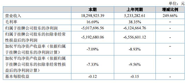 報(bào)告期內(nèi),公司主營(yíng)業(yè)務(wù)收入18,298,925.39元,較去年同期5,233,282.61元上漲13,065,642.78元,漲幅為249.66%;公司凈利潤(rùn)-5,017,696.56元,較去年同期-6,124,664.76元,減少虧損額1,106,968.20元。