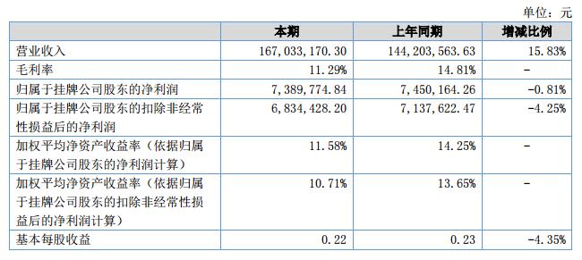 報(bào)告期內(nèi)公司銷售167,033,170.30元與去年同期相比增長15.83%;報(bào)告期內(nèi)實(shí)現(xiàn)凈利潤7,389,774.84元與去年同期相比下降0.81%。