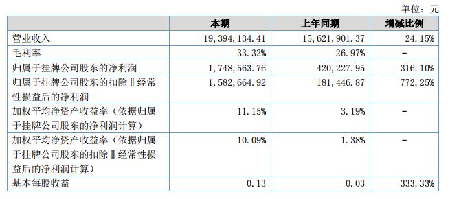 報告期內,公司實現營業(yè)收入19,394,134.41元,上年同期實現營業(yè)收入15,621,901.37元,同比增長24.15%,營業(yè)成本為12,931,456.56元,上年同期營業(yè)成本為11,408,400.85元,同比增長13.35%,毛利率33.32%,上年同期毛利率26.97%,同比增長23.55%。?