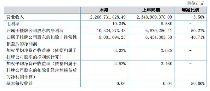 報告期內(nèi),公司營業(yè)收入(合并口徑,未經(jīng)審計,下同)22.67億元(人民幣,下同),較上年同期降低3.50%,歸屬于母公司所有者權(quán)益凈利潤1032.43萬元,較上年同期增長50.27%。?