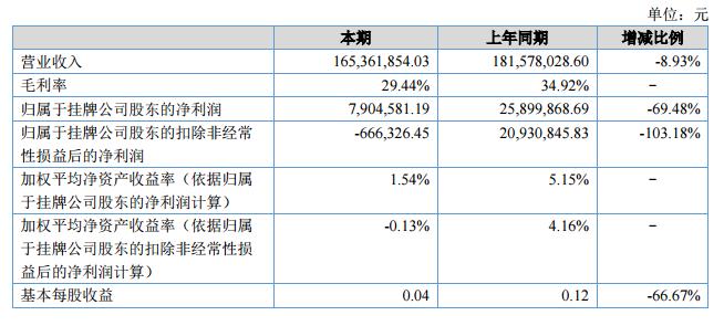 報告期內(nèi),公司實現(xiàn)營業(yè)收入165,361,854.03元,其中主營業(yè)務(wù)收入164,236,528.20元,其他業(yè)務(wù)收入1,125,325.83元;營業(yè)收入比上年同期下降8.93%;報告期內(nèi),公司實現(xiàn)營業(yè)成本116,682,937.00元,其中主營業(yè)務(wù)成本為115,822,850.14元,其他業(yè)務(wù)成本為860,086.86元;營業(yè)成本比上年同期下降1.26%;歸屬于掛牌公司股東的凈利潤7,904,581.19元,比上年同期下降69.48%。?