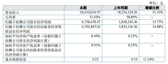 報(bào)告期內(nèi)公司實(shí)現(xiàn)營(yíng)業(yè)收入24,010,014.97元,比上年同期增長(zhǎng)31.53%,公司實(shí)現(xiàn)凈利潤(rùn)6,758,678.47元,比上年同期增長(zhǎng)15.77%。?