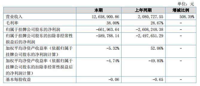 2018年半年度,實(shí)現(xiàn)營(yíng)業(yè)收入12,658,900.86元,較上年同期增長(zhǎng)508.39%,主要系公司抓住市場(chǎng)機(jī)遇,通過(guò)多年的運(yùn)營(yíng)積累的客戶(hù)資源和技術(shù)實(shí)力,合同簽約量增長(zhǎng)較快;同時(shí)帶來(lái)凈利潤(rùn)水平的逐漸提高。2018年6月末資產(chǎn)總額為27,721,319.38元,較上年末增長(zhǎng)13.00%,變動(dòng)不大;負(fù)債總額為15,382,952.30元,較上年末增長(zhǎng)30.82%,主要系營(yíng)業(yè)收入規(guī)模的增長(zhǎng)帶來(lái)應(yīng)付賬款余額的增加;2018年6月末所有者權(quán)益余額為12,338,367.08元,較上年末下降3.41%,變動(dòng)不大;2018年6月末應(yīng)收賬款余額為12,777,200.71元,較上年末增長(zhǎng)64.24%,主要系營(yíng)業(yè)收入規(guī)模的增長(zhǎng)。?