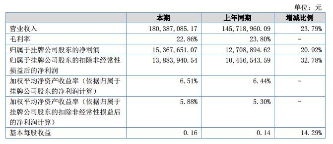 報(bào)告期內(nèi)歸屬于掛牌公司股東的凈資產(chǎn)24,373.79萬元,較去年同期增長6.73%,系報(bào)告期內(nèi)實(shí)現(xiàn)凈利潤所致。公司營業(yè)收入18,038.71萬元,較去年同期增長23.79%;營業(yè)成本13,914.45萬元,較去年同期增長25.31%,報(bào)告期內(nèi)實(shí)現(xiàn)歸屬于掛牌公司股東的凈利潤1,536.77萬元,較去年同期上升20.92%。?
