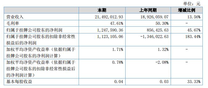 報告期內(nèi)公司實(shí)現(xiàn)營業(yè)收入21,492,012.93元,較上年同期增加13.56%,主要是公司繼續(xù)加大市場推廣和開拓所致;營業(yè)成本11,259,401.85元,較上年同期增加19.71%,主要是原輔料材價格上漲,人工成本增加所致;報告期內(nèi)實(shí)現(xiàn)利潤總額1,340,495.01元、凈利潤1,247,590.36元,較上年同期分別增加28.63%、45.67%,主要是加大市場開拓和優(yōu)化公司管理所致。?